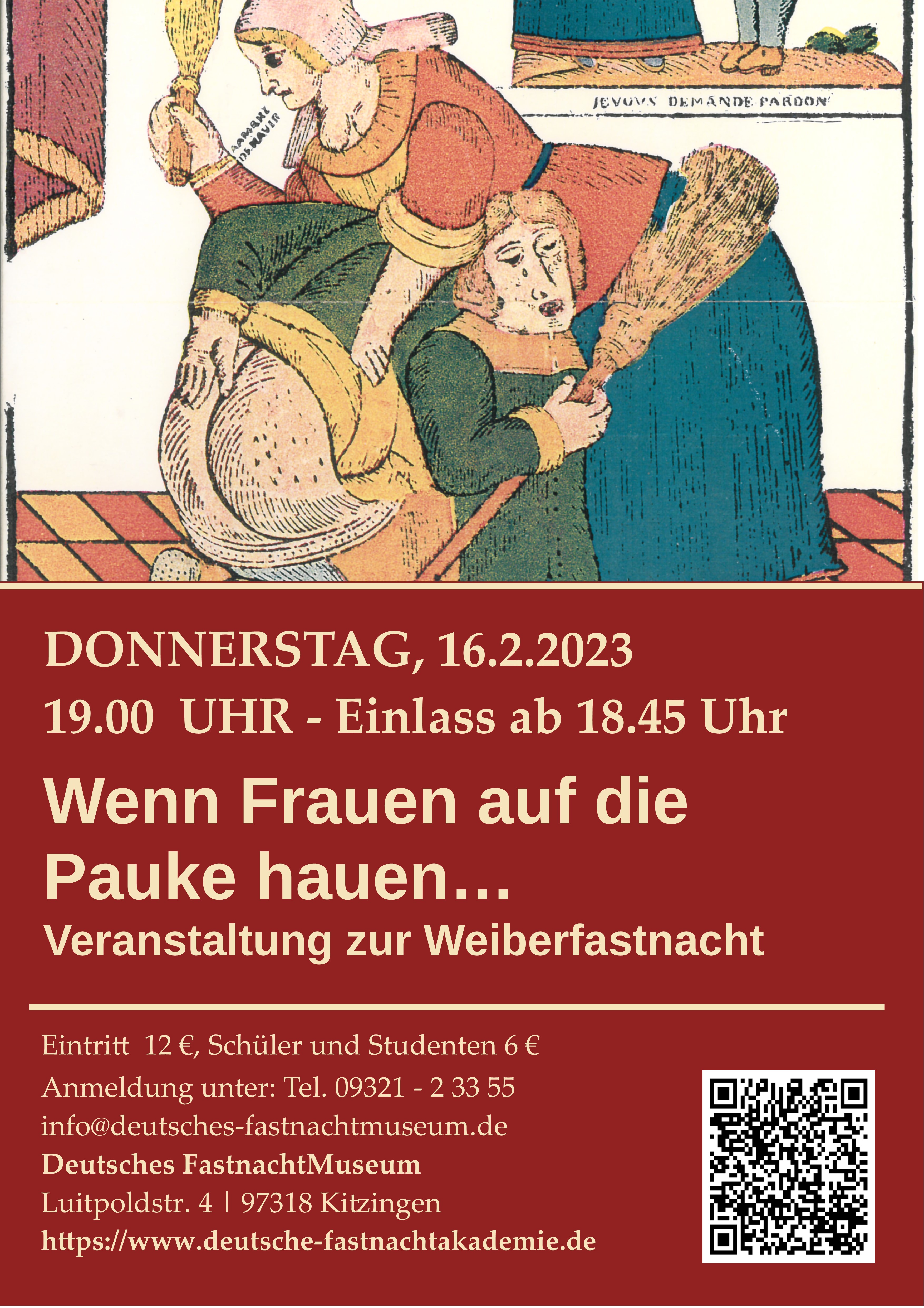 Am Donnerstag, 16. Februar 2023 um 19.00 Uhr präsentiert das Deutsche Fastnachtmuseum im Saal der Akademie ein Programm zur Emanzipation, nicht nur auf fastnächtlicher Ebene. Hans Driesel und das weibliche Museumsteam blättern auf höchst amüsante Weise im Bilderbuch der Frauengeschichte(n). Dabei kommt auch immer wieder zu Tage, wie die „unterdrückte“ Weiblichkeit ihre „Unterdrücker“ am Nasenring durch die Weltmanege führte. Auch mit den Waffen der Frau. So riet zum Beispiel nicht erst Alice Schwarzer zum ‚Streik im Bett‘ - dieser Aufruf findet sich schon vierhundert Jahre vor Christus in der Komödie „Lysistrata“ von Aristophanes. Doch die Akteur*innen bleiben nicht in der Antike. Neben Betrachtungen zur Gründung des ersten Frauenkomitees vor 199 Jahren finden sich Namen wie Margit Sponheimer und die ersten Ritterinnen ‚wider den tierischen Ernst‘. Auszüge aus Frauen-Reden unserer Tage runden das Programm ab. Es lesen, spielen und rezitieren: Katrin Hesse, Ingrid Klier, Britta Volbers und Romana Wahner. Konzept und dienstbarer Geist: Hans Driesel